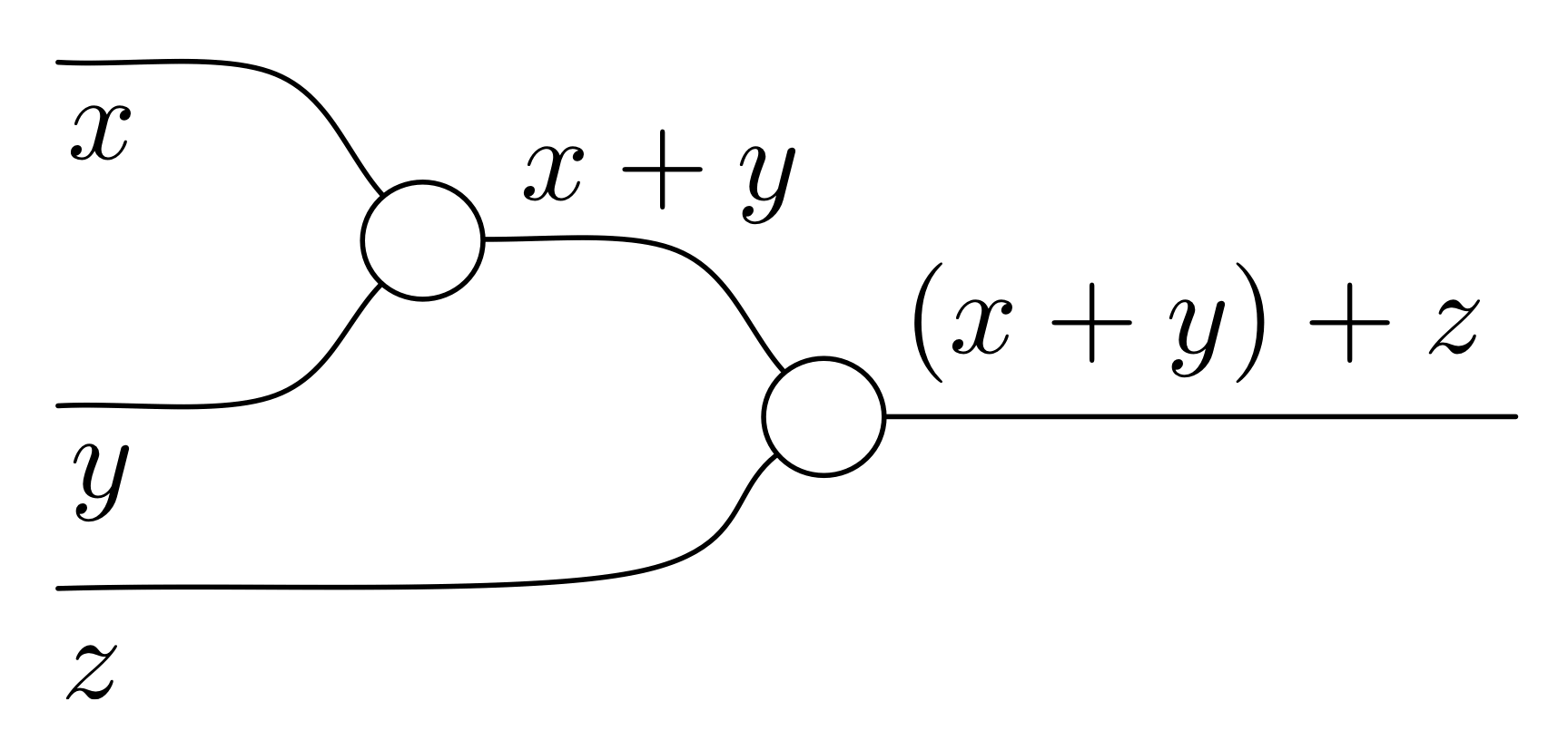 (Assoc) captures the associativity property of addition. Let’s try to figure out what it says and why it makes sense. Consider the left hand side, and think about variables x, y and z arriving on the dangling wires from the left: x on the topmost, then y on the middle and z on the bottom wire. In the left diagram, the first thing that happens is that we add x and y, and then we add z to the result. Like this: