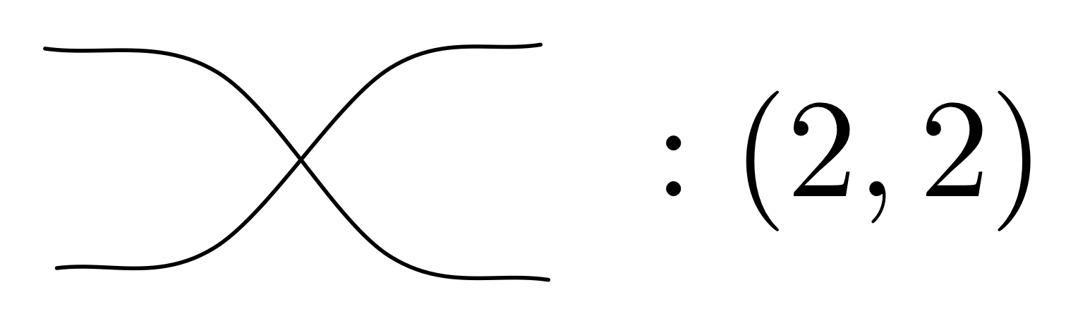 Diagrams are very much like magic Lego from the last episode. Remember how the important thing with magic Lego was keeping track of the number of holes on the left and the number of studs on the right? Diagrams are similarly easy: we only need to record the number of dangling wires. Here’s the diagram for addition that we discussed two episodes ago, together with the associated information (2,1) that tells us that there are two dangling wires on the left, and one dangling wire on the right.