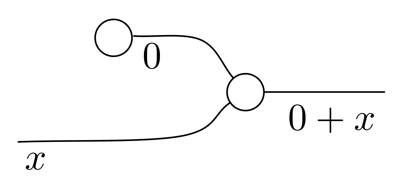 A number arrives on the dangling wire on the left, let’s call it x. We know that the only thing that can exit from the zero generator is 0. Then 0 is fed in as the first argument to addition, and x as the second. The result is 0 + x. Of course, we know that adding zero to any number does not have any effect. So, whatever the x, 0 + x is simply x. It follows that the behaviour of the left hand side and the right hand side of (Unit) is exactly the same.