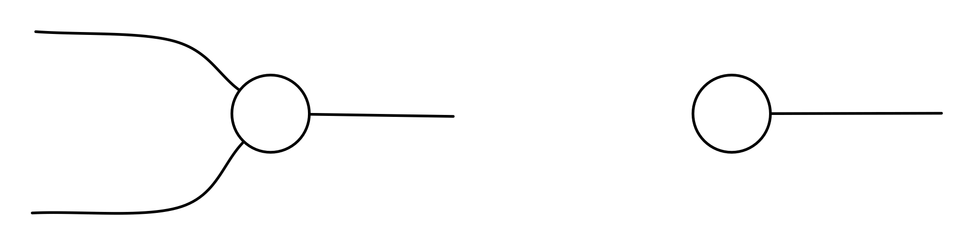 The four rules cover all you need to know about diagrams in order to do graphical linear algebra. You may be wondering why does it all work; where do the rules come from? The answer is that the diagrams, which many people call string diagrams, are actually a very nice notation for elements of mathematical structures called PROPs (which stands for product and permutation categories, somehow). PROPs are, in turn, examples of mathematical structures called symmetric monoidal categories. It is not important, at the moment, to delve into their arcane lore. Instead, keeping rules 1-4 in mind, we can start having fun.