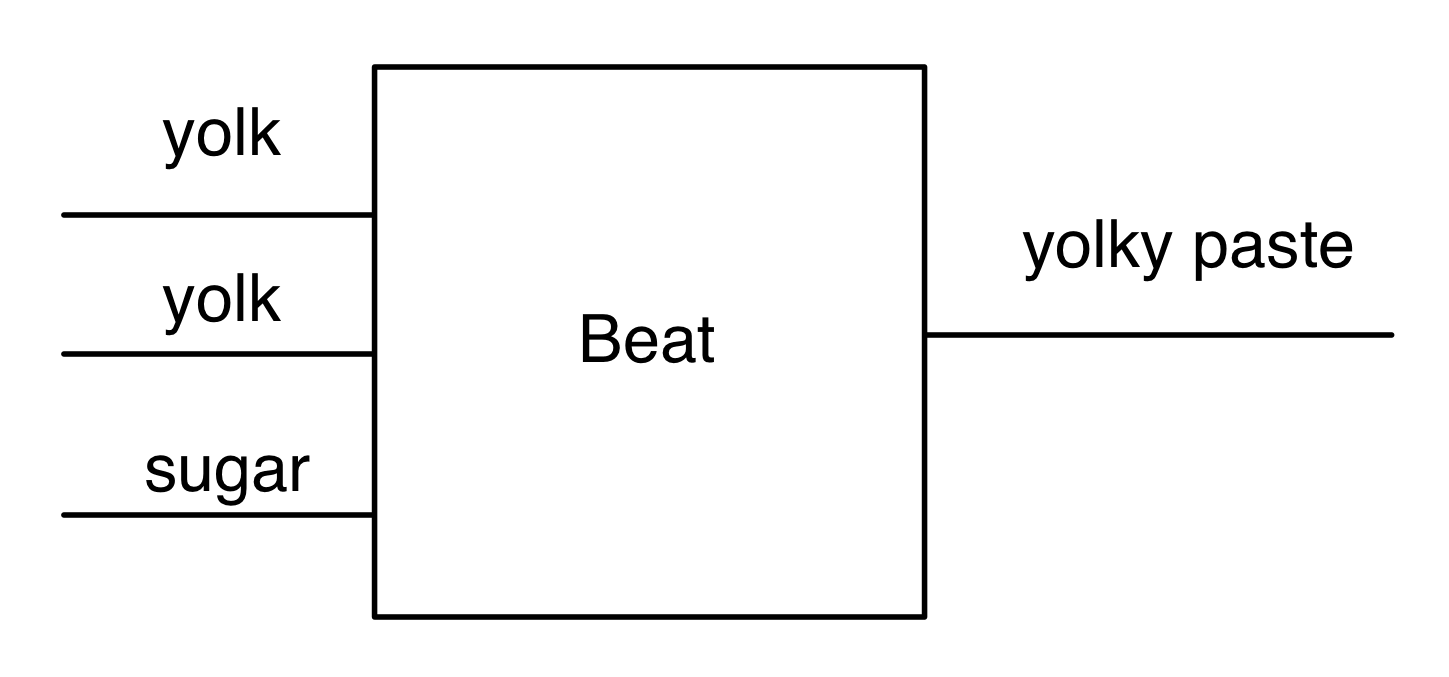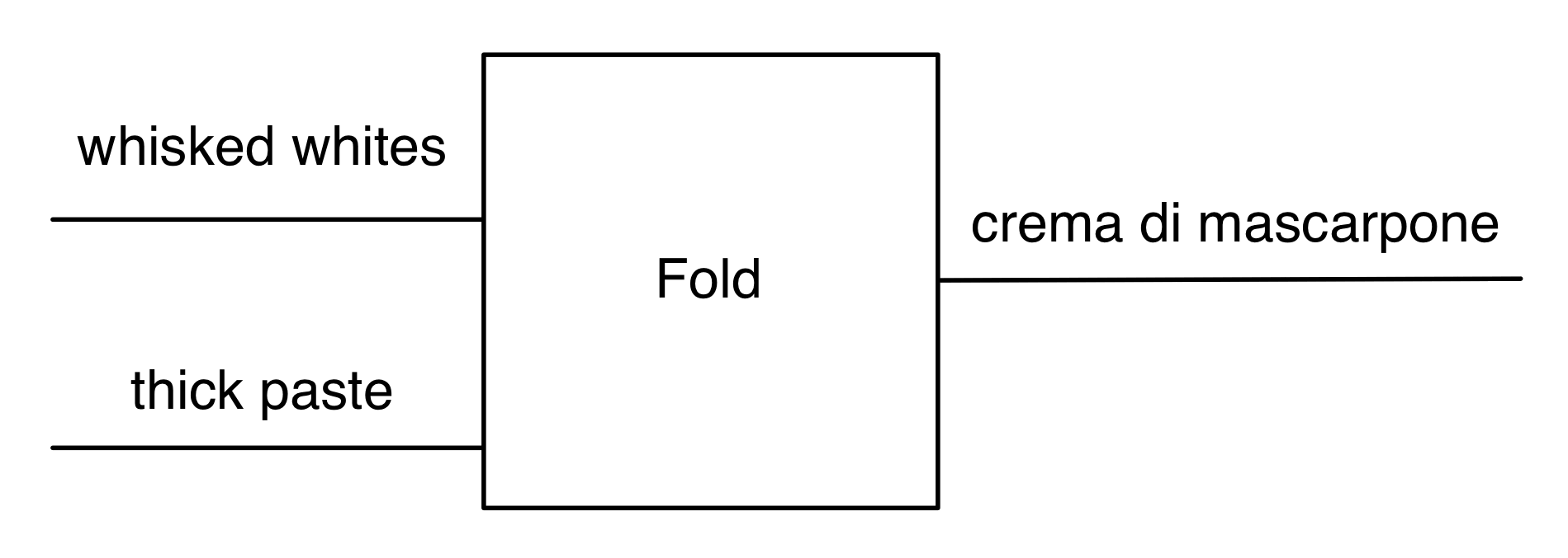 You will need two eggs, 200g of Mascarpone and 2 tablespoons of white sugar. We will represent the recipe for Crema di Mascarpone as a diagram, but since making food is much more complicated than addition, we first need to introduce a whole load of generators:
