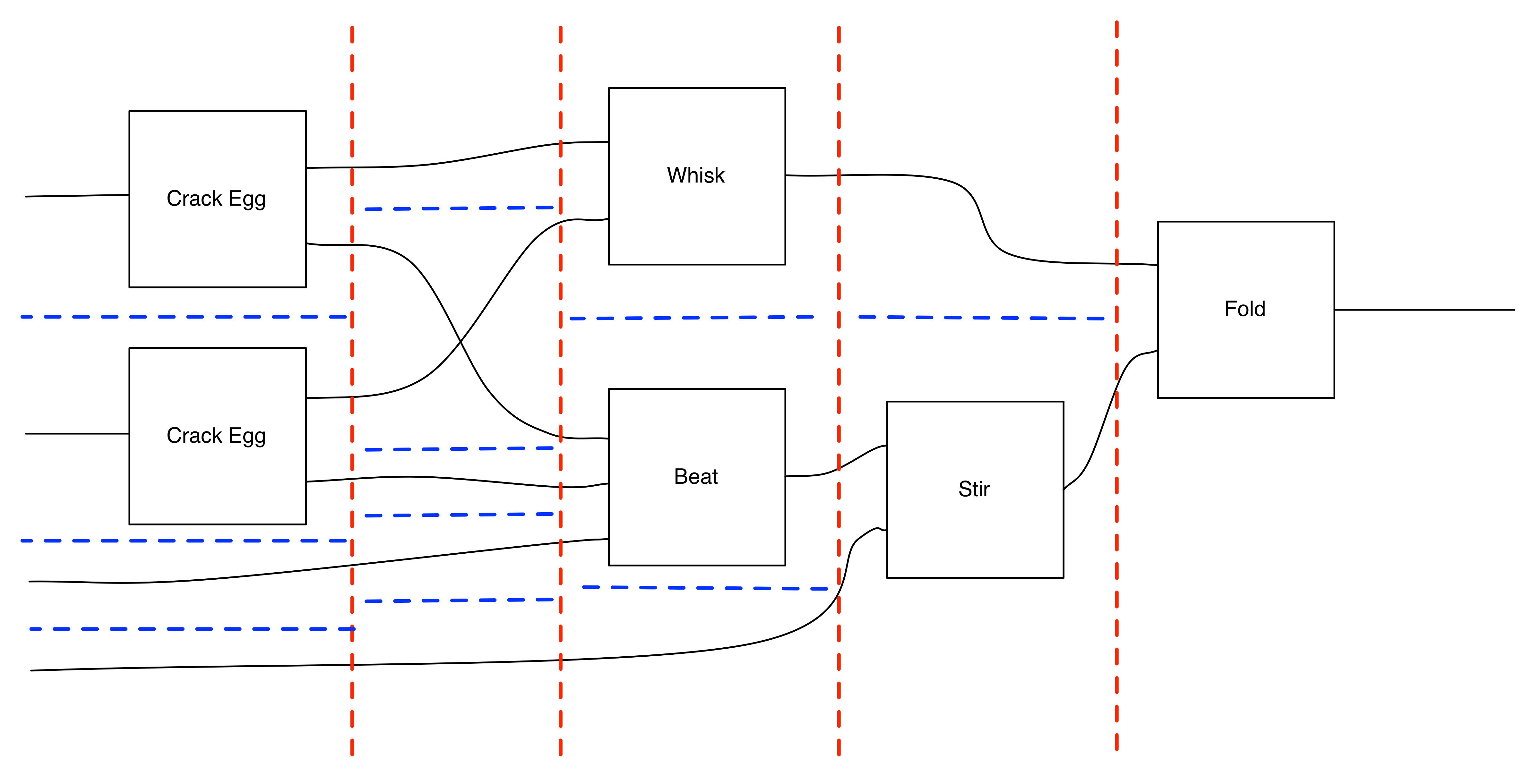 So, essentially, we can wait with the cracking of the egg until we finish the whisking, and just rearrange the egg and the whisked egg white on our ingredient table beforehand. Look at the two diagrams above and imagine the Crack Egg generator sliding from its position in the first diagram to its position in the second diagram. Simple!