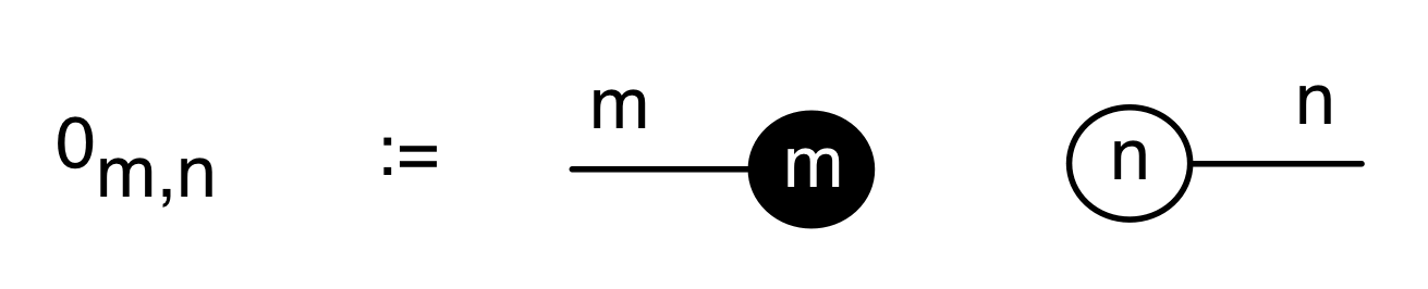 Let’s compare the two ways. In the traditional approach, one first defines the natural numbers and then “bootstraps” matrices on top. With diagrams, there is no precedence given to natural numbers as such; everything gets defined at the same time. Natural numbers can be recovered as special kinds of diagrams, those with one dangling wire on each end. We don’t need to invent any extra formulas for multiplying matrices because composition is a basic operation of the algebra of diagrams. Matrix addition is not a primitive operation at all, it can be constructed from the diagrammatic primitives.