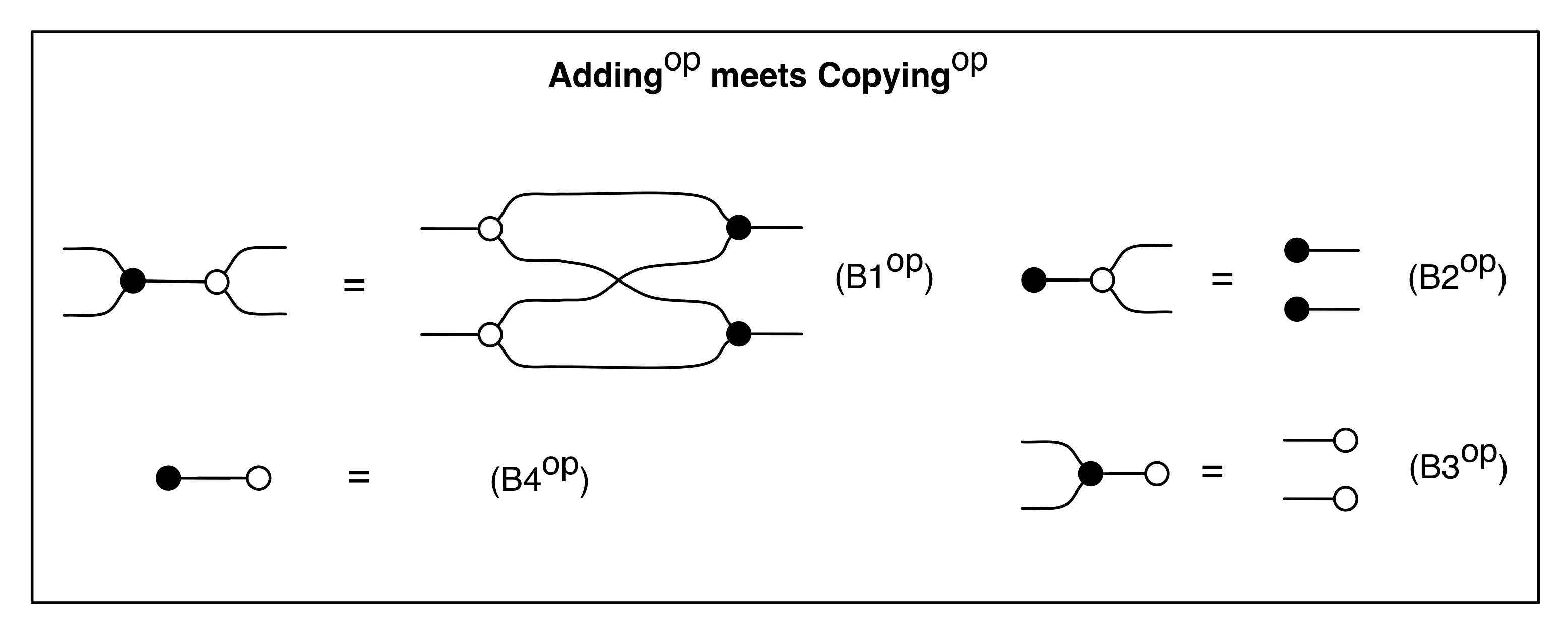 In a very precise sense that we will eventually make clear, this theory, lets call it F, is dual to the theory we have been calling B, the theory of bimonoids. Remember that B consists of those equations that describes the interactions between adding and copying. Here’s a reminder of the equations, which by now we know quite well.