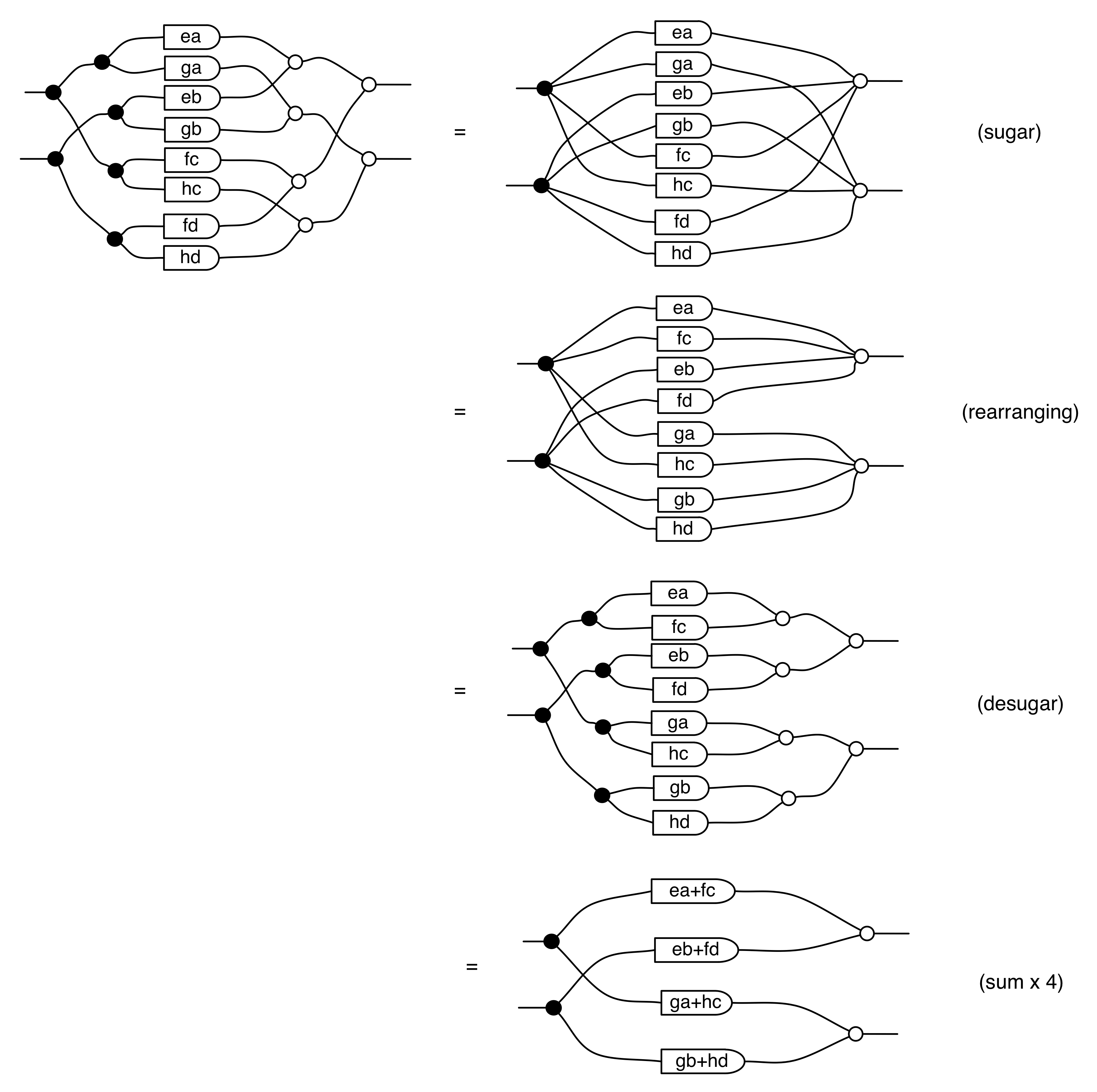 for some natural number k of wires with one antipode and some natural number l of wires with no antipode. This is because we can always get rid of redundant discards and zeros with (Counit) and (Unit), cancel out multiple antipodes in series using (†), then rearrange, and eat up any annoying permutations with the iterated copy and add sugars.